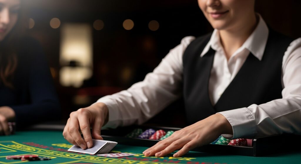 你不仅可以在屏幕前观看荷官的发牌过程,还能与其他玩家进行实时互动,让娱乐体验更真实、更沉浸。